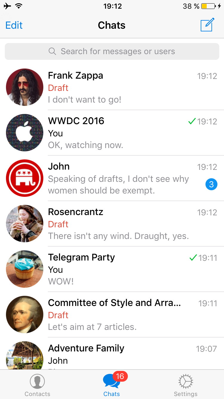 Today we're introducing Drafts. Unfinished messages are now clearly visible in the chats list, and the chat with an unsent draft will move to the top. What's more – all your drafts are now synced across all your devices. Now you can start typing on your phone, then continue on your computer – right where you left off.